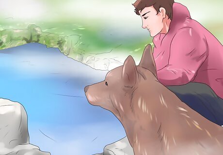 Go hiking. One fun thing you can do to create a stronger bond with your dog is to go on a hike with him or her. Just spend the morning or the late afternoon checking out a new mountain, park, or nature-filled area with your dog and enjoy exploring the outdoors with him. Keep your dog on a leash unless you’re in a safe area where it’s okay for him to run free. Make sure the hiking area allows dogs in advance, and that you have some water and treats on hand for your favorite creature. Making a routine of going hiking with your dog at least once a week can help strengthen your bond. As you hike together, pay attention to what your dog likes or dislikes. See if he prefers climbing up mountains, playing in wooded areas, or exploring the ground near water. Don’t make him do something he doesn’t want to do.