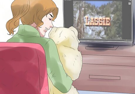 Watch a dog-themed movie together. Though it may sound silly and your dog won’t really know that he’s watching a dog on television, you can have a nice time watching a dog-themed movie with your dog. You can watch Lassie, Homeward Bound, Lady and the Tramp, or a number of other dog-themed flicks while hanging out with your favorite creature for a few hours. Pay attention to your dog while watching the movie and make sure to give him lots of affection, petting, and maybe even a few treats. Setting aside some time to watch a movie with your dog will let you slow down and just hang out with your dog without creating a bunch of elaborate plans for your bonding time. Though activities are nice, so is just hanging out, the same as it is when you’re hanging out with people.