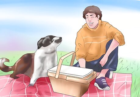 Go on a picnic. Dogs love being outside, and if you want to bond with your dog, you should find as many ways to be outdoors with your dog or your whole family as possible. Take your dog out to a nice, pretty park on a warm day, bring some dog-friendly food, and some regular food for your family, and have a nice time bonding with your pet. Just make sure that you’re giving your dog the attention he deserves if you’re with other people. You can even take your dog for a walk around the picnic area. This can also be a great time to play Frisbee or catch with your dog, or just to let your dog run free. Any time you’re letting your dog be happy and free, you will be strengthening your bond because he’ll associate you with good feelings.