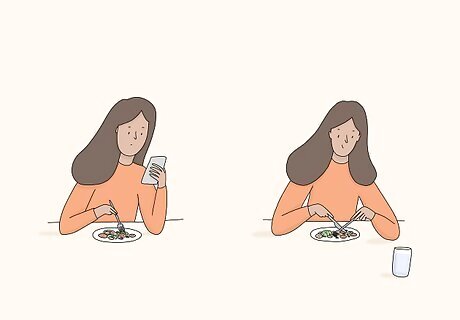 Pay attention when you eat to avoid bingeing. Eating mindfully will help you slow down at meals, making you feel more satisfied at the times you do eat. Slow down, chew your food thoroughly, and pay attention to the textures and flavors on your tongue. Turn off your phone, TV, computer, radio, and remove all other distractions when you’re sitting down to eat. Put your fork down every five bites or so and sip on water to help you slow down and ease digestion.
