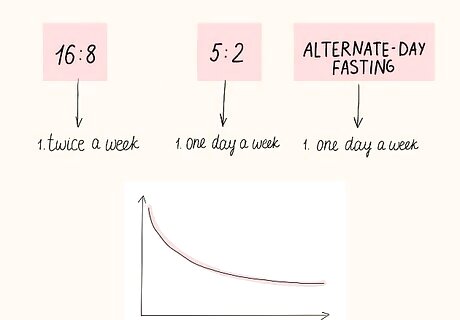 Ease into your IF diet so your body gradually acclimates to less food. Adopting an intense fasting schedule right away might set you up for bingeing on unhealthy foods in the future. No matter what method you choose, start slow, practicing the fast only once per week and working your way up. For instance, if you choose to adopt an 8 hour eating window (the 16:8 method), start by doing this only twice and week then add a day the next week and so on until you’re practicing it your desired number of days. If you choose the 5:2 method (eating only 500 to 600 calories 2 days of the week), start with just one day a week. Or gradually reduce your calories two days out of the week until you get down to 500 to 600 calories on those two fasting days. If you plan to fast on alternating days, start by choosing 1 day a week to eat no food before adding in the 2nd day the following week. This plan is only meant for the short-term because over a long period of time, you won’t be getting all of your necessary nutrients.