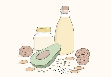 Eat healthy fats to keep you feeling fuller longer. Fats help regulate your appetite hormones and slow down gastric emptying, which means you won’t feel as hungry during fasting periods. Just make sure they’re healthy fats full of omega 3 fatty acids. Healthy fats like avocado, olive oil, coconut oil, flax seeds, chia seeds, nuts, and nut butters all have omega 3 fatty acids. Balance your omega 3’s with omega 6 fatty acids. Sources include safflower oil, sunflower oil, corn oil, soybean oil, sunflower seeds, walnuts, and pumpkin seeds. Avoid trans fats found in fried foods and anything made with partially hydrogenated vegetable oils. These unhealthy fats won’t keep you satiated and will increase your LDL (unhealthy) cholesterol levels.