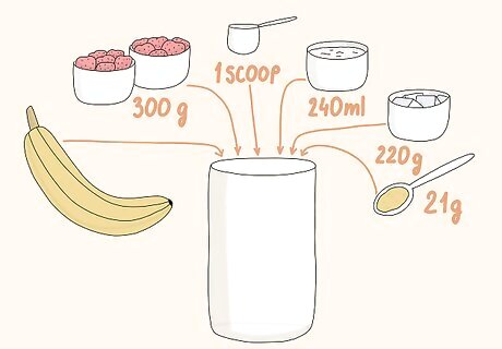 Drink smoothies to ease digestion after a long fast. Your digestive system will be more sensitive after a fasting period of 16 hours or more, so avoid eating anything too heavy from the get-go. Stick with a protein-rich smoothie, ideally made at home with fresh produce, milk, or yogurt. For a simple, nutritious smoothie, blend 2 cups (300 g) of frozen strawberries, 1 banana (peeled), 1 cup (240 mL) of milk (any kind), 1 cup (220 g) of ice, 1 tablespoon (21 g) of honey, and 1 scoop of protein powder (any kind, optional). Add 1 tablespoon (15 mL) of coconut oil or nut butter to your smoothie for extra fats that will keep you satiated. If you’re on the 5:2 intermittent fasting plan (eating regularly most days and eating 500 to 600 calories 2 days out of the week), choose a low-calorie option like a fruit smoothie made with water and a scoop of protein powder.