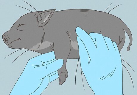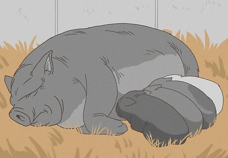 Provide good bedding. Bedding for the mother and babies can be small amounts of clean hay, shredded paper or wood chips. The amount used of each type of material should never be so much that the baby piglet can become tangled in it. Household items such as rugs or blankets should not be used. This area needs a heat source, such as a heat lamp. Baby piglets have no control over their body temperature for about 3 days. They need to be kept in an environment of at least 90 degrees during this time; therefore, a heat source may be required even in the summer. The mother pig will move away from the heat, should be become too hot. The farrowing area needs to be big enough for her to do this comfortably. Size of the farrowing area also helps prevent the accidental crushing of the babies by their mother. Most farrowing areas have 2X4 boards attached to the sides of the area. These boards are placed about 6 inches (15.2 cm) from the floor. This allows the babies to escape under or on top of the board, should their mother suddenly begin plop down in their direction.
