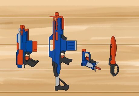 Select your loadout. The most important things in your bag should be at least two Nerf, Dart Zone, or 3D printed blasters. If you have 5 to 6 blasters at your home, then bring three. Make sure to read your games rules beforehand to see what blasters and blaster mods are allowed Choose a primary blaster. This will be your main blaster and should have common type of ammo like 12.7/70mm or 12.7/36mm if you are using a dart blaster or .75cal if you're using a Rival blaster. This blaster should be light in weight, normal in size, and should preferably be compatible with either N-Strike magazines, Talon mags, Katana mags, or Dart Zone Pro mags. Choose a secondary blaster. This will be your second most important blaster as it will be the one saving your life on the battlefield after your primary blaster runs out of ammo. The best secondaries are lighter and have something your main blaster doesn't (such as faster rate of fire, special dart types [if you have rules for them], or lower FPS to tag closer targets). Choose a backup blaster. This blaster should not see use unless you have no time to reload. It should be as small as a Jolt, Triad, X-Shot Micro, or Double Strike so you can carry it in your pocket or on a tactical vest. Choose a melee weapon (completely optional and some games don't allow it). If you have a Nerf sword or chainsaw so you can use it to silently attack your enemies and not get caught!