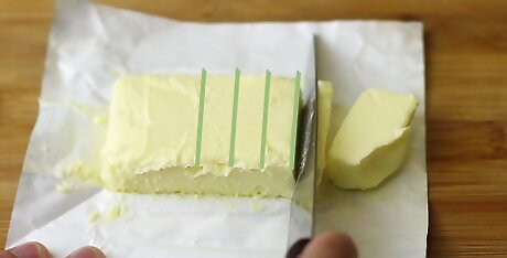 Cut your butter into ⁄2 inch (1.3 cm) slices. Use the measurements indicated on the unsalted butter packaging or just eyeball the width of the cut. The most important thing is that the unsalted butter slices are all approximately the same size, so they will melt evenly. Don't worry about the temperature of the butter when you're cutting it. It can be mushy at room temperature or hard from the fridge. You're going to be melting the butter, so its temperature doesn't make a difference.
