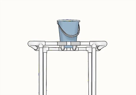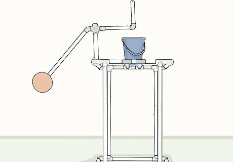 Place the bucket and dunking mechanism on top of the tank. Set the long pipe from the dunking mechanism into the tee on the top frame. Cement it in place to secure it. Next, position the bucket over the small pipes in the center of the frame. Rotate it so the flapper valve faces the overhanging pipe on the dunking mechanism. Make sure the bucket is stable on the frame and has plenty of room to dump water on the person sitting below it. The water will spill through the gap in the pipes on the frame.