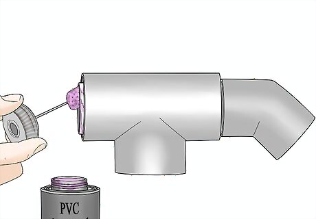 Spread some PVC cement on the exposed end of the pipe. Select PVC cement to ensure the connections are as strong and waterproof as you can make them. PVC cement generally comes with an applicator brush you can use to spread the product around the opening of the pipe. The glue goes on the outside of the exposed pipe, since you will be putting a connector over it. PVC cement is a special kind of glue used to ensure PVC pipes stick together and stay waterproof. It’s usually sold in buckets at hardware stores. Make sure the pipe is clean before applying the cement. Dirt and moisture could prevent it from working properly.