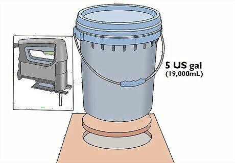 Use a bucket to outline and cut a hole in a piece of plywood. Set a 5 US gal (19,000 mL) bucket on top of a ⁄2 in (1.3 cm)-thick piece of plywood. To keep the bucket steady, clamp the plywood to a workbench using a bar clamp. Trace around the bottom of the bucket with a pencil. Then, cut the hole with a jigsaw. The bucket and other materials needed are available online or at most hardware stores. Purchase a new bucket or save old buckets used for other projects, such as mixing concrete. Save the wood circle you cut out. It’s meant to be the target for the dunk tank. If you don’t have a jigsaw, you could simply use a square piece of plywood for the target. You could also use another type of material. The size of the target can also vary, so adjust it as you would like!