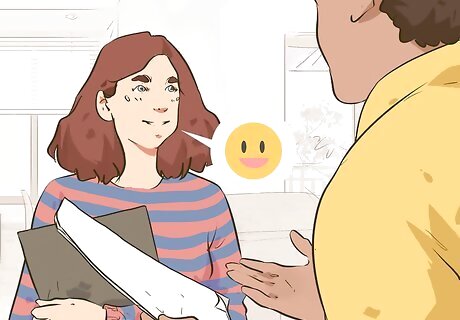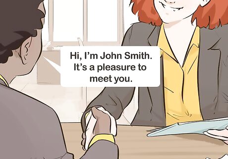 Greet the interviewer and shake their hand. When the employer is ready for the interview, make eye contact with them and smile. Introduce yourself by name, being sure not to interrupt or talk over them. Offer a firm handshake and try not to squeeze too hard or else it will come off as too aggressive. As you shake their hand, you may say, “Hi, I'm Jane Smith. It's a pleasure to meet you.”