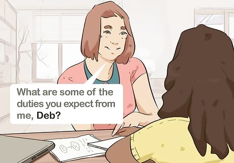 Address the interviewer by name so you can feel a connection to one another. When you learn the interviewer's name, incorporate it into your conversation a few times so they feel more open around you. Only use their name when it sounds natural since overusing it could make your interviewer feel uncomfortable. For example, you may add their name to a question like, “What are some of the duties you expect from me, Deb?” If you're able to, ask the interviewer for their name before you come in so you can address them by it right away when you arrive.