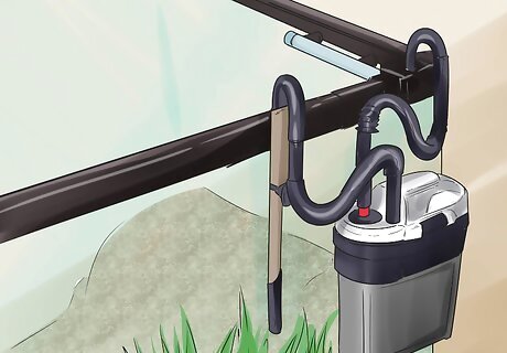 Install a filtration system. Because turtles excrete waste in the water in which they swim, you will need to install a filtration system and pump for aquatic turtles, just as you would with a pet fish. Because turtles can be quite messy, you should choose a system rated for an aquarium twice the volume of the habitat you've selected.