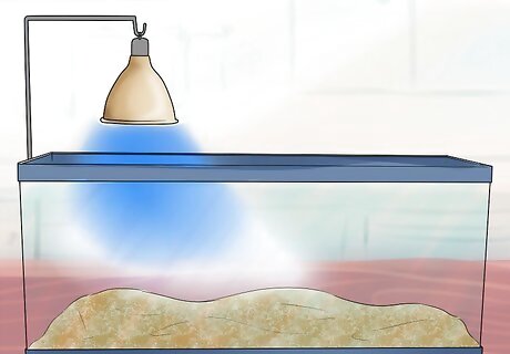 Provide adequate UVA and UVB lighting. Turtles are cold blooded, requiring energy from the sun to function. To simulate the natural light your turtle requires to be happy and healthy, you will need to provide two sources of lighting: a UV-A basking bulb and a UV-B fluorescent bulb. Both of these light sources must be on and available to the turtle all day, although you may turn them off at night. Be sure to select bulbs which explicitly provide UV-A and UV-B light. Many generic basking lamps are insufficient for reptile care. Your UV-A bulb should be positioned over a region of dry terrain in your turtle habitat, so that the turtle can bask in it outside of water. You should use a ground fault circuit interrupter, a device used to prevent electrocution, to connect your lamps to the electrical outlet. This will ensure that if a lamp falls into the habitat's water it will not electrocute your turtle.