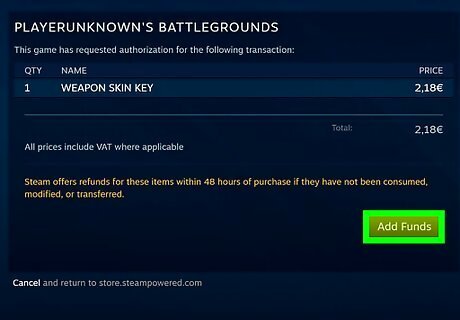 Add funds to your account. If you already have enough money in your Steam wallet to cover the purchase, you can skip this step. Your Steam wallet total is at the top of the window. To add funds, click Add Funds, select an amount, and then follow the on-screen instructions to process your payment.
