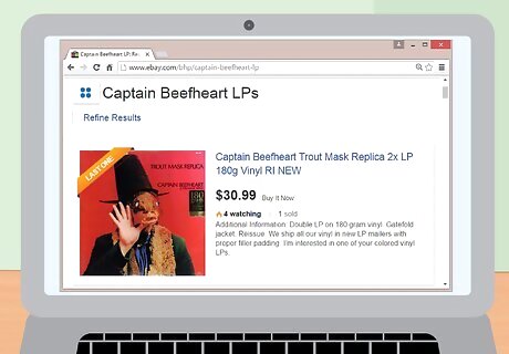 Search online for tough-to-find records, but be wary of conditions. Buying used records online is a great way to round out your collection and dig out hard-to-find pressings, but it comes with its challenges. Namely, you need to be aware of the vinyl rating system, as this is your best indicator of a record's quality online. That said, you should take some extra precautions: Only buy from recommended or trusted sellers. Check their history on eBay, Discogs, or whatever record pricing platform you use and make sure they give honest, trustworthy ratings (VG+ or higher) for their records. Always assume that a record is a grade lower than it is advertised, as most sellers will be generous with their rating. In general, it isn't advised to by any record online not rated VG+ or higher if you plan to play it regularly.