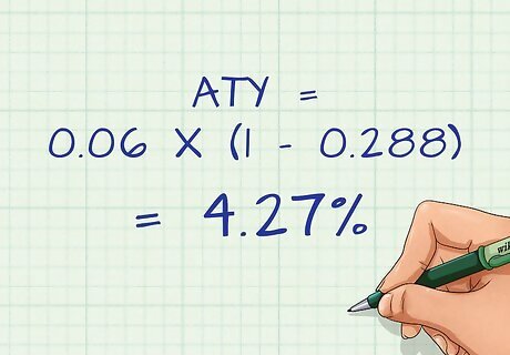 Do the calculation. Input your variables into the equation and solve. Make sure that you've used the correct marginal tax rate for appropriate year. The result is your after-tax yield. Remember to convert your percentages to decimals when calculating the after tax yield. Convert by dividing by 100. For example, 6% would be 6/100, or 0.06. For example, with the 6% corporate bond and the 28.8 percent marginal tax rate, your after-tax yield would be calculated using the following equation: A T Y = 0.06 ∗ ( 1 − 0.288 ) {\displaystyle ATY=0.06*(1-0.288)} ATY=0.06*(1-0.288) This calculations gives an after-tax yield of 0.0427, or 4.27%.