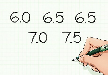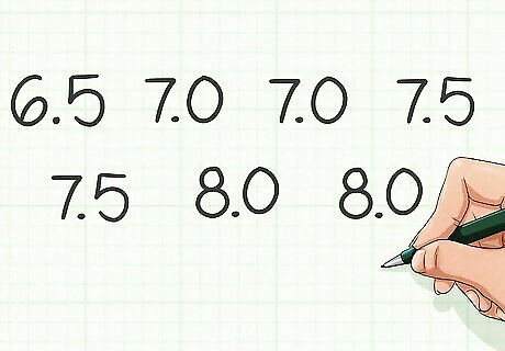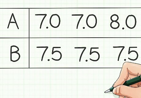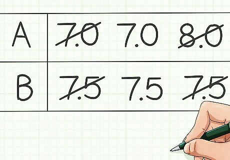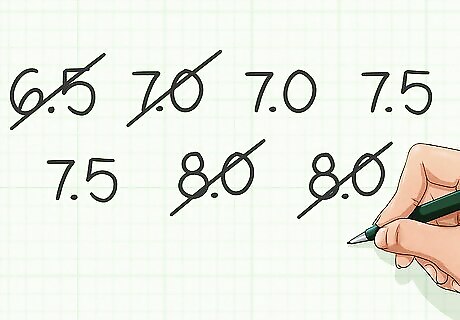 Cross out the outliers. This step depends on how many judges there are: Seven judges: Cross out the two highest and the two lowest scores. Five judges: Cross out the highest and lowest scores. Three judges: Use all three scores. Example: There were seven judges, so cross out two scores on each end: 6.5, 7.0, 7.0, 7.5, 7.5, 8.0, and 8.0.