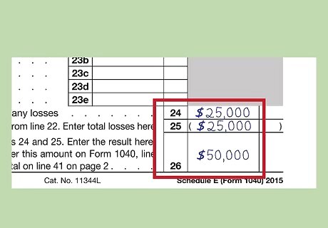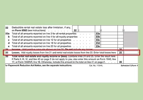 Enter any losses on Line 25. This includes any deductible rental real estate losses you entered on line 22 after calculating passive activity losses using Form 8582. Passive activity losses are complicated, but generally, you can deduct as much as $25,000 a year in losses on rental properties if you have an adjusted gross income of less than $100,000.