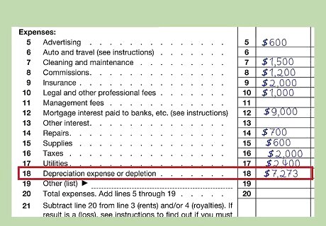 Calculate any depreciation expenses. While repairs such as painting or replacing a roof can be deducted all at once, improvements such as adding a swimming pool or installing new insulation generally must be depreciated over several years rather than deducted in the year you paid for them. Note that depreciation expenses reduce the cost basis of your rental property and increase any gains you receive when you eventually sell the property. Generally, you need to take your cost or other tax basis for the property, allocate that cost to the different types of property included in your rental, and then use the rates, methods and useful lives specified by the IRS for those types of property to find your annual depreciation. You can allocate a portion of the cost of the property to land (if you rent out a house, not an apartment). Look at the local property tax assessment and see how the value of the property is allocated between the building and improvements versus land. You do not get a depreciation deduction for land. For instance, if the property tax assessor has allocated 20% of the property's value to land, you would allocate $40,000 to land (20% x $200,000), which is not depreciated. Then, you can allocate $160,000 ($200,000 - $40,000) to the building, which would be depreciated over 27.5 years (which is the typical length for residential real estate). Property such as fences or furniture typically is depreciated using the declining balance method. The IRS indicates you should depreciate furniture using 200% declining balance. To find your yearly depreciation, refer to the declining balance tables published by the IRS.