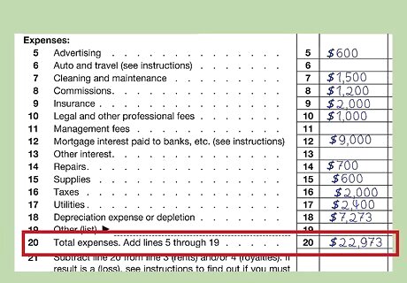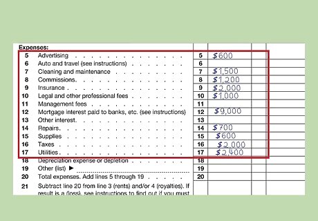 Gather and categorize expenses you've incurred on each rental property. You are able to deduct expenses for maintaining, conserving, and managing your rental properties. The expenses on Schedule E are broken up into specific categories such as advertising, management fees, repairs, supplies, taxes, and utilities. Add up your expenses for each category, then put that amount in the correct box. As with income, make sure you're matching up the correct expenses in the column for the correct property, if you have more than one property listed on the schedule.