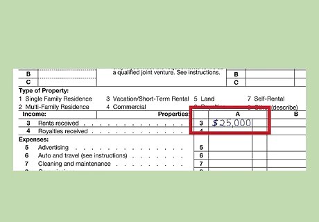 Enter that total on Line 3 of your Schedule E, after "Rents received."You can list rental income for as many as 3 properties on a single Schedule E. The schedule provides three columns for each of the 3 properties. Make sure the physical addresses you list under 1a match up with the rents. For example, suppose you own houses for rent on 123 Main Street and 345 Mulberry Street. You list the Main Street house next to "A" and the Mulberry Street house next to "B." When you fill in your income, make sure you put the rent you receive for the Main Street house in column A and the Mulberry Street house rent in column B. For the purposes of the example, assume you received $100,000 in rent for the house on Main Street, and $80,000 in rent for the house on Mulberry Street. If you have more than 3 rental properties you must use an additional form.