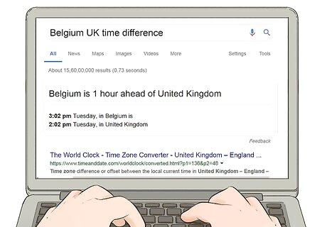 Figure out the time difference between Belgium and your country. Belgium operates on a GMT+2 timezone, meaning it is 2 hours ahead of the United Kingdom. Find the time difference between Belgium and your country by finding the GMT adjustment in your timezone, and call at a time that is convenient for both parties. You can find your country's GMT adjustment here: https://greenwichmeantime.com/
