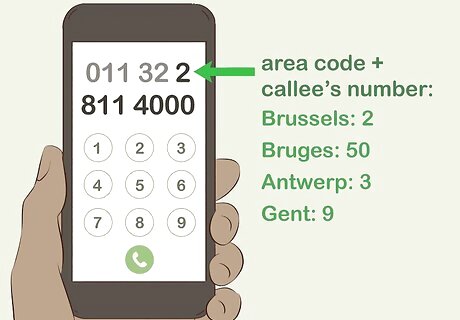 Type your contact's area code (if applicable) and number. After you input the exit code and Belgium's country code, you may need to enter an area code before you dial the number. However, not all numbers in Belgium contain an area code — landlines are 8 digits not including the area code, whereas mobile phones are 9 digits with the area code. Some common area codes in Belgium are as follows: Brussels: 2 Bruges: 50 Antwerp: 3 Gent: 9 For example, a call from the U.S. to the U.S. embassy in Brussels will look like 011-32-2-811-4000 in your phone.