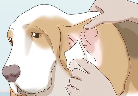 Keep skin and ear infections at bay. Since yeast and bacteria commonly grow in between a Basset Hound's skin folds, the breed is prone to skin and ear infections. After walks, inspect your dog's folds and ears for foreign bodies, such as mites, dirt, grease, or other buildup. In addition to daily spot checks, thoroughly clean these areas two or three times a week to avoid infection. Skin lesions or cankers are easy to find, but it can be tricky to spot the signs of ear infection. Notice if your dog shakes its head more than usual or seems like it's trying to remove something from its ear canal. You may also notice a musty or foul odor in your dog's ear. Check the inner ear for redness or a discharge, usually dark brown to black or yellowish-brown in color. Take your dog to the vet for a more accurate diagnosis and, if necessary, prescription medication if you spot a skin or ear infection.