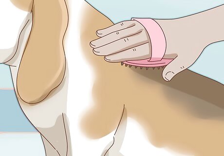 Cut down on shedding and loose hair by brushing weekly. Basset Hounds are heavy shedders, and loose or dead hair tends to build up in their coats. Brushing with a rubber dog brush at least two or three times a week will keep their coat healthy. In addition, it will cut down on the hair that ends up on your clothes and furniture.