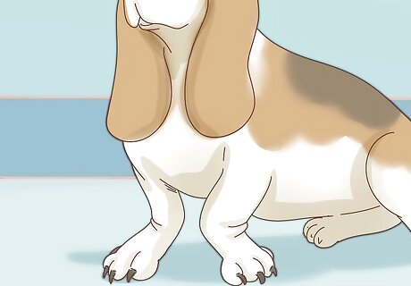 Maintain your dog’s teeth and nails. Basset Hounds require nail and tooth care standard for most dogs. Brush your dog’s teeth at least three times a week using gauze wrapped around your finger, water and, if desired, dog toothpaste. Trim its nails as needed, typically once every couple weeks. If your dog is still a puppy, you need to start nail trims and toothbrushing early to train them to allow you to do it. Practicing with your puppy when it's young will make it easier to groom your dog when it's an adult. Don’t use regular toothpaste to brush your dog’s teeth because it may contain ingredients that are harmful to dogs. You can find toothpaste for dogs in the pet supply section of your local department store or at a pet supply store. Using an electric grinder or hand file instead of clippers reduces the risk of cutting too much nail off, which can cause pain or bleeding. If you can hear clicking when your dog walks, it’s due for a clipping. Its nails should rest at or just above the floor so the dog doesn’t have to put too much weight on the backs of its paws.