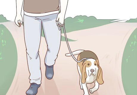 Take your Basset Hound on daily walks. Though they’re laid back, Basset Hounds require plenty of daily exercise. A daily walk of 30 to 60 minutes will help keep your dog in shape. While they make great dogs for people who live in apartments or small homes, an enclosed yard will allow your dog to run around and follow its nose.