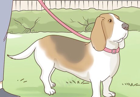 Avoid letting it off its leash. When out for a walk or outside of an enclosed area, keep your dog on a leash. Basset Hounds tend to follow scents and wander without responding to come commands. Your can easily lose track of your dog.