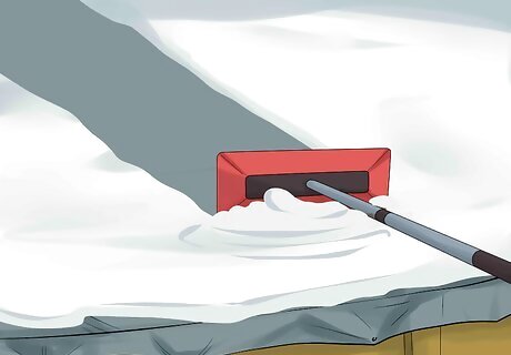 Let it be as much as possible. A frozen pool is better left alone. Unless it gets covered with a fresh layer of snow, in which case this is the best time to remove (see above). With the ice below, it should be easier to remove most of the snow. However, use utmost caution when getting snow off your pool. Do not risk walking atop the ice. To remove snow, gently use a long broom to push snow off the cover. Do not use anything with sharp edges such as a shovel, as this can cause damage to the winter pool cover. Use a roof rake to pull the snow off the top. If the snow is lightweight, even a leaf blower will serve the purpose.