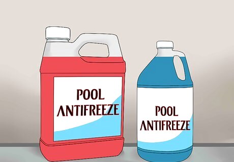 Use pool antifreeze. For in-ground pools, either use pool antifreeze (not car antifreeze!) or blow out all valves and water lines with either a powerful reverse vacuum or an air compressor. You can also use both in combination, first blowing and then cycling antifreeze through the lines. To add antifreeze: Add the product as instructed and circulate at least two minutes or as directed. Plug all lines with special winterizing plugs. Finally, blow out the drain underneath the pool from the opposite end before capping. When bubbles appear, immediately cap the drain line. The vapor lock caused will prevent the drain from gathering water and freezing in harsh climates.