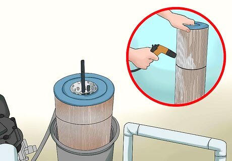 Clean the pool equipment. Remove remaining chlorine from the chlorinator. Clean out the skimmer basket. Backwash or clean the filter to type: Both cartridge filters and D.E. grids – filters made with diatomaceous earth – can be flushed thoroughly with a garden hose fitted with a sprayer nozzle to create enough water pressure to remove contaminants. Sand filters, on the other hand, require backwashing according to the manufacturer’s instructions.