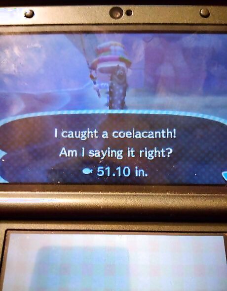 Catch the fish. Press the "A" button to launch out your fishing rod, and wait until the coelacanth bites. Then, before too late, press the "A" button once more. If you get to an animation of the fish spinning in circles with your character trying to pull in the fishing rod, you have successfully caught it. If you get a fish that's not the coelacanth, don't fret. It's a rare fish.IMG_20190214_234139.jpg If you do get it, you'll know, because your character will go "Holy fish sticks!"IMG_20190214_234029.jpg