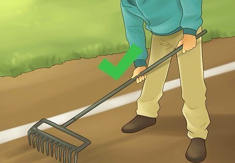 Rake up and down along the length of the base paths. Once your chalk lines are in place, you’ll need to rake along them on either side using a regular garden rake. This will clear the base path of debris and smooth over any uneven parts.
