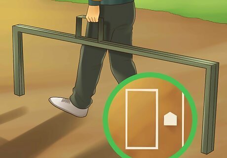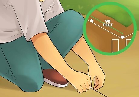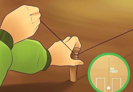 Connect a string from the home plate to the rear edge of first base. Drive a stake into the ground at the pointed end of the home plate (where the catcher squats). Tie a string to it and line it up with the edge of the plate that leads to first base. When you arrive at the rear edge of the base, tie the end to another stake and drive it into the ground. The string will measure 90 feet (27.4 m).