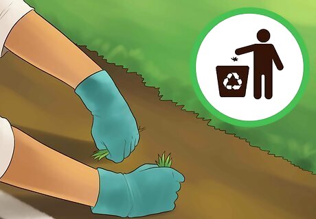 Remove weeds along the lines. Grip the weeds by their roots and pull them straight up. Put them in the rubbish bin. Use care to take up the whole root, otherwise the weed will soon return.