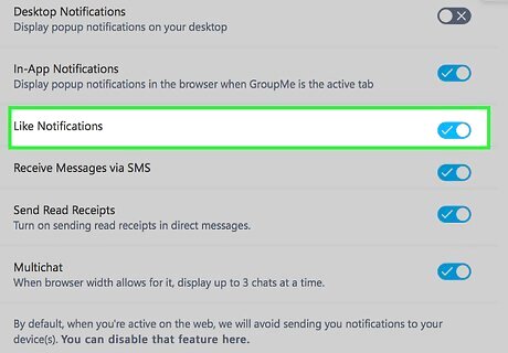 Turn on/off Like Notifications. On GroupMe, users can "Like" messages that are sent to a group by tapping the heart icon that displays to the right of the message. If you would like to be notified when this happens, tap the sliding button to the right of "Like Notifications" so that it displays as blue. If you would not like to be notified, slide this button to the left so that it displays as gray.