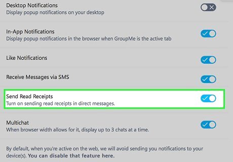 Send Read Receipts. If you would like your contacts in GroupMe to know when you have read a message they send to you or a group you are in, tap the sliding button to the right of "Send Read Receipts" so that it displays as blue. If you would not like to be notified, slide this button to the left so that it displays as gray.