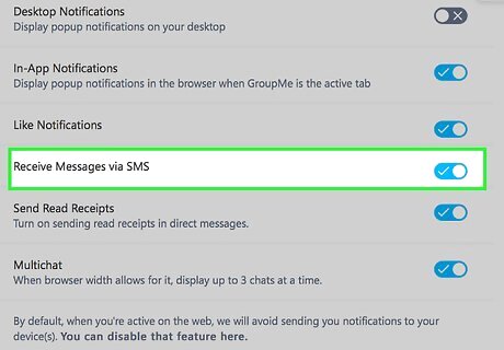 Turn on/off SMS messages. If you would like to receive or stop receiving text messages from GroupMe when a new message is sent to a group you're in, tap the sliding button to the right of "Receive SMS Messages".