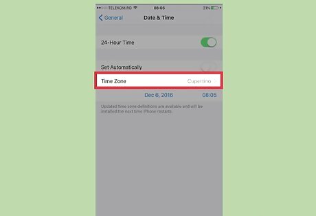 To manually change the timezone on your iPhone: Open the ⚙ Settings app → Tap ⚙ General → Tap Date & Time → Set Set Automatically to OFF (slider should be grayed out) → Tap Time Zone → Enter a new city to where you want the timezone set → Tap the correct city in the results.