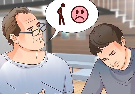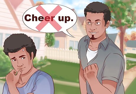 Don't downplay how he's feeling. If your child is experiencing something troubling, it's important to make him feel that his emotions are being validated. This starts with how you initiate conversations with your child and carries through to how you respond when he tells you what's wrong. Let your child talk about whatever is bothering him. Even if it's something that's difficult for you to tell him about, it's important that you listen and respond honestly and affectionately. Never tell a child (or anyone, for that matter) to "snap out of it," "cheer up," or "pull yourself together." Saying these things can send a message to your child that his feelings don't matter. Similarly, never tell your child that his situation "isn't so bad" - that may be true from your adult perspective, but to your child, feeling abandoned by his friend at lunch could be a crushing loss. Recognize that many sad children also experience coexisting emotions, like anger or fear. Be patient and try to talk your child down if he's feeling scared or mad at someone.