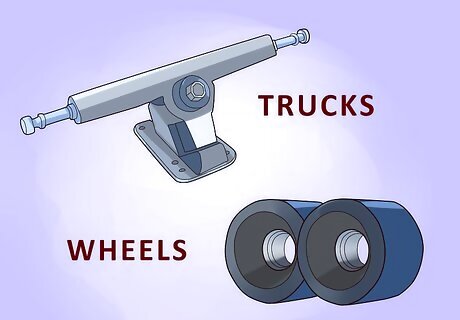 Learn your hardware. Remember that “deck” and “board” can be interchangeable when talking about the literal board in your longboard. However, realize that there are other parts to consider when you’re talking about boards as a whole, rather than a single part. These include: Trucks, which are the T-shaped objects mounted to the bottom of your deck. Wheels, which are attached to the axels of each truck