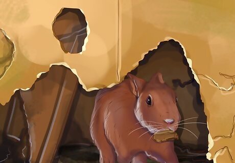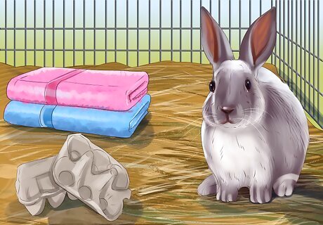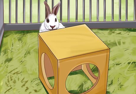 Give your rabbit a cardboard box to play in. Cut some holes in a cardboard box so that the rabbit can easily get in and out of it. This box could range from a large cardboard box to a tissue box filled with paper or hay. Whatever type of box it is, your rabbit will likely chew it into pieces. Make sure that all plastic tape or lining is removed from the box before giving it to your rabbit.