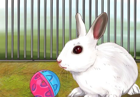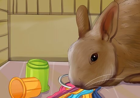 Observe your rabbit when new toys are introduced. When you add a new toy to your rabbit's cage, you need to make sure that it will not be a danger to your pet. Watch your rabbit play with the toy and make sure that the animal plays with it safely. Make sure that the toy cannot be destroyed by the rabbit quickly and that no non-digestible pieces don't break off. If your rabbit is tearing apart a plastic toy really quickly, it may not be the right toy for your pet. Your rabbit's toys should be strong enough to withstand their teeth.