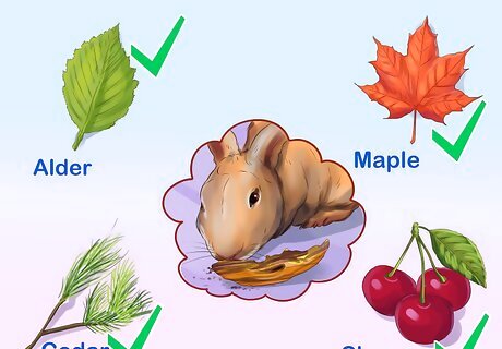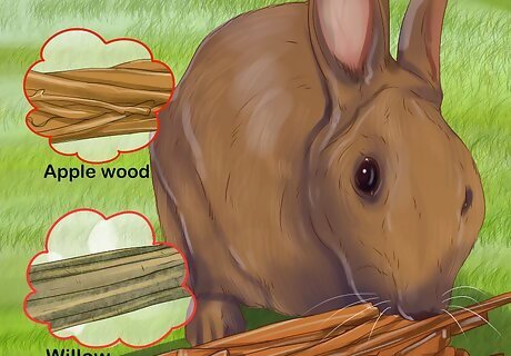 Provide small pieces of wood. Rabbits like to chew on wood. It is fun for them but it is also important for the health of their teeth. Cut small pieces of willow, aspen, or apple wood and give them to your rabbit. There are some types of wood that may be toxic to rabbits. Don't give a rabbit wood from an apricot, cherry, plum, or peach tree.