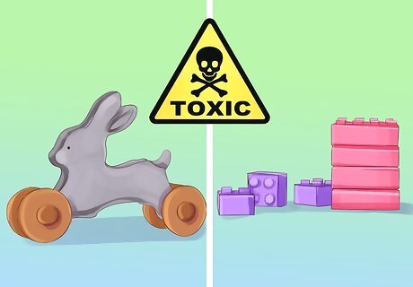 Avoid buying toys made of toxic materials. When adding items to your rabbits cage, make sure they are made of materials that are not toxic to rabbits. A rabbit will chew on just about anything, so everything you put in its cage should be either really strong or made of chewable materials that can be digested. For example, don't give your rabbit toys that contain toxic tape or glues. Giving the animal only items that are glue or tape free, or are made for pets, can help you avoid this.