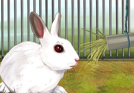 Stuff a toilet paper roll with hay. To give your rabbit something fun to chew on, cut the edges of a paper roll and bend them out. Then stuff the tube with the rabbit's hay, which is typically timothy hay. This will be a fun object for the rabbit to chew on. A paper towel roll will be a great substitute for a toy your rabbits can chew on.. Rabbits should eat mostly grass hays, such as timothy or meadow hay. You can give your rabbit a small amount of alfalfa or clover hay but it should only be used sparingly, as too much can cause urinary tract problems in rabbits.